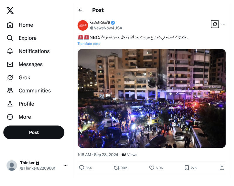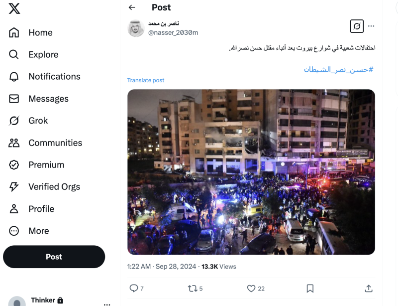 نشرت حسابات على منصة إكس صورة ادعت أنها لاحتفالات في بيروت بمقتل حسن نصر الله في غارات اسرائيلية استهدفت مقر حزب الله بالضاحية الجنوبية ببيروت، لكن الادعاء ليس صحيحا.