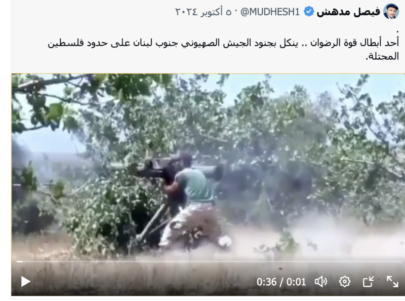 نشرت حسابات وصفحات على منصة إكس مقطع فيديو ادعت أنه يوثق قيام أحد عناصر قوات الرضوان التابعة لحزب الله باستهداف جنود الجيش الإسرائيلي جنوب لبنان مؤخرا، لكن الحقيقة هذا المقطع قديم