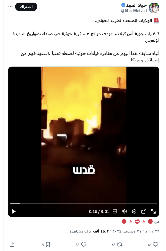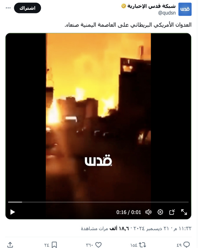 نشرت حسابات وصفحات على منصة إكس مقطع فيديو ادعت أنه يظهر غارة أمريكية على العاصمة اليمنية صنعاء وقت متأخر من ليل 21 ديسمبر