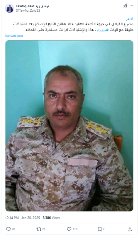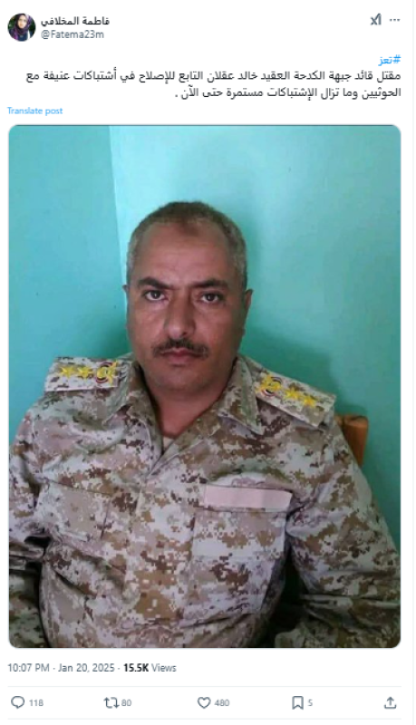 نشرت حسابات وصفحات على منصتي إكس وفيسبوك خبرًا ادّعت فيه أنّ قائد جبهة الكدحة الموالي للحكومة العقيد خالد عقلان قُتل في اشتباكات مع جماعة الحوثي غرب محافظة تعز، لكن الادعاء غير صحيح.