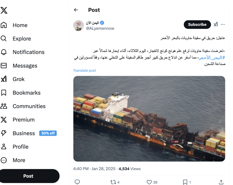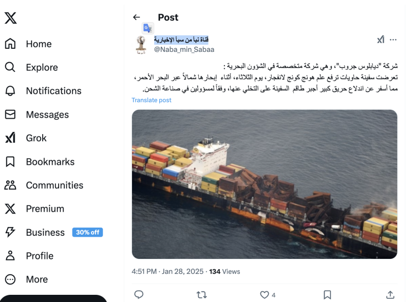 نشرت حسابات على منصة إكس صورة ادعت أنها لسفينة تعرضت للإنفجار في البحر الأحمر اليوم الثلاثاء 28 يناير ، لكن الادعاء ليس صحيحا.
