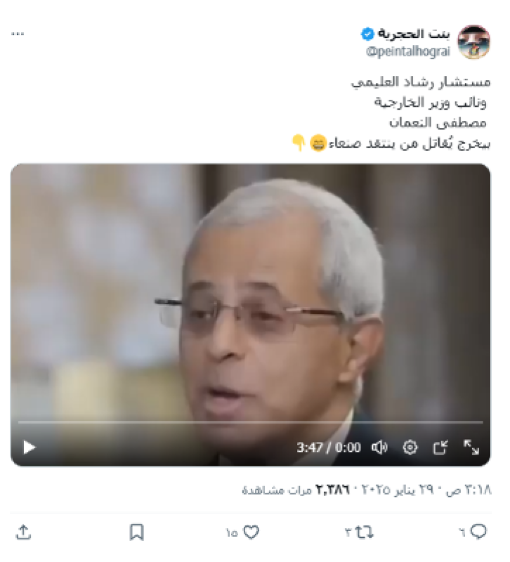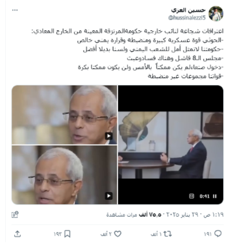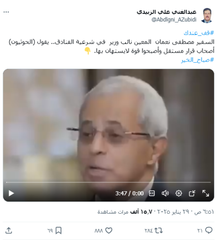 نشر حساب القيادي في جماعة الحوثيين حسين العزي تغريدة من وحي مقابلة تلفزيونية أجريت مع نائب وزير الخارجية في الحكومة الشرعية المعين حديثا مصطفى النعمان، مدعيا أن المقابلة تحمل اعترافات شجاعة بقوة جماعة الحوثيين وعدم تبعيتهم لإيران، وأعاد العشرات من الحسابات نشر التغريدة ، لكن الادعاء ليس صحيحا