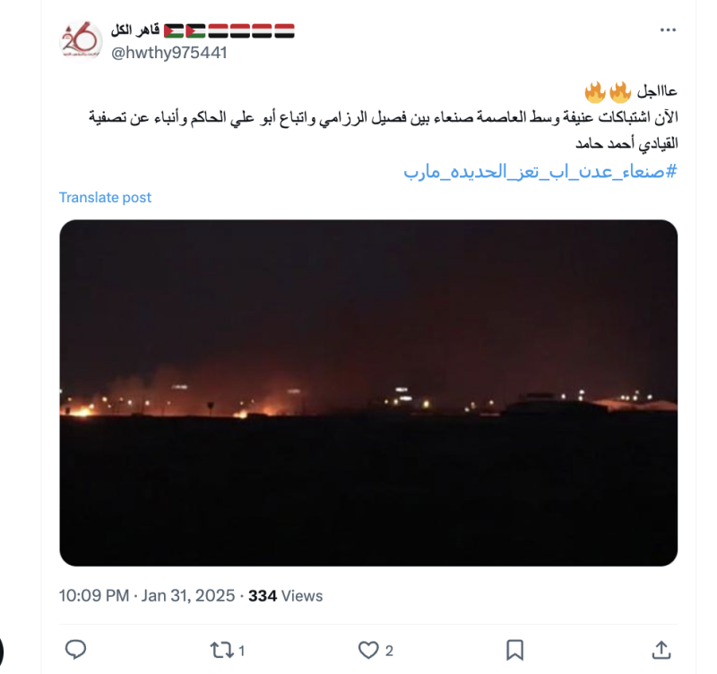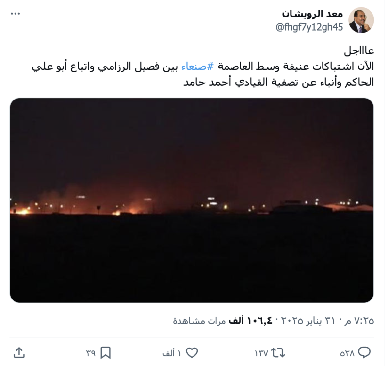 نشرت حسابات وصفحات على منصة إكس صورة مدعين أنها تظهر اشتباكات عنيفة وسط العاصمة صنعاء بين فصيلين من جماعة الحوثيين.