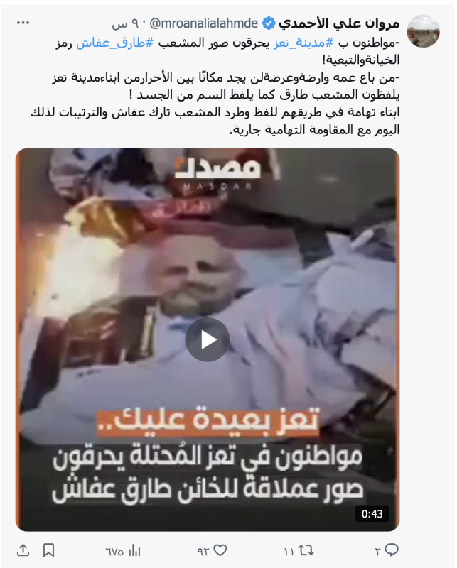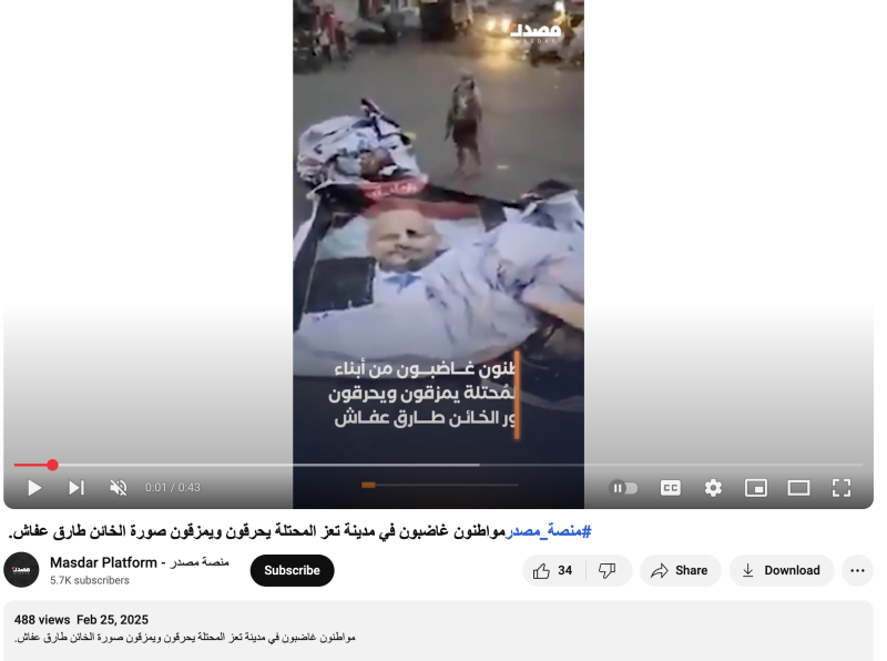 نشرت منصة مصدر على يوتيوب مقطع فيديو، يظهر حرق صور عضو مجلس القيادة الرئاسي في اليمن طارق صالح في مدينة تعز مدعية أنه حديث.