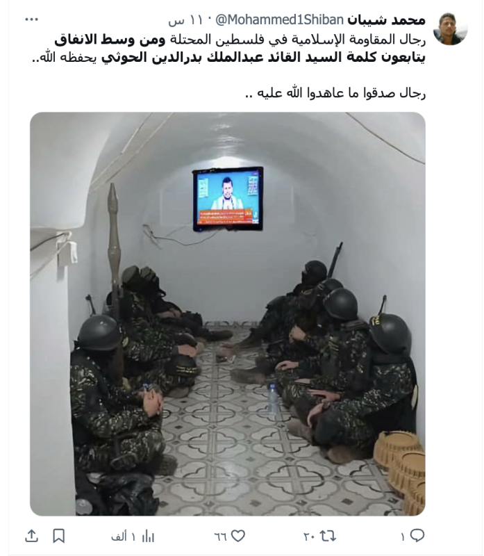 نشرت حسابات وصفحات على منصة إكس صورة ادعت أنها لمقاتلين في المقاومة الفلسطينية يتابعون خطاب الحوثي الأخيرة لكن الادعاء ليس صحيحا
