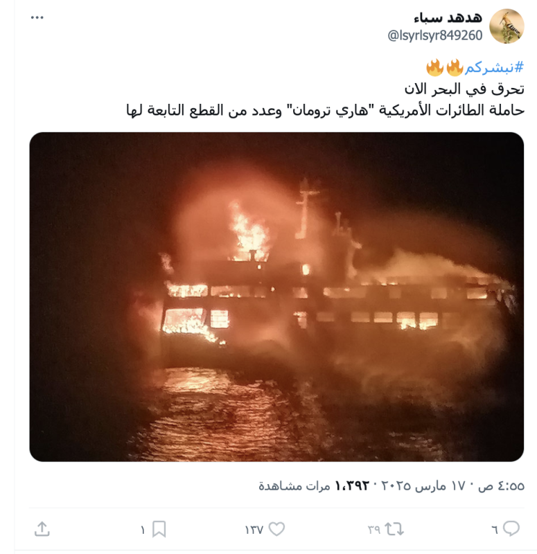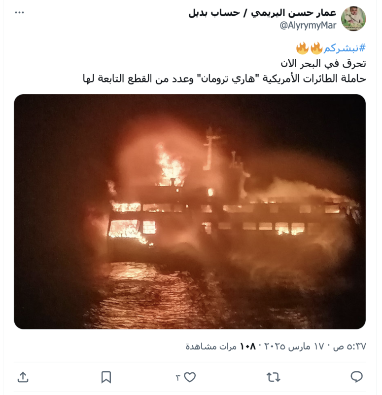 نشرت حسابات على منصة إكس صورة لسفينة تحترق في البحر مدعية أنها لحاملة الطائرات هاري ترومان بعد قصفها من قبل جماعة الحوثي.