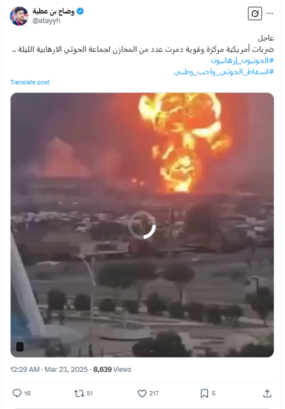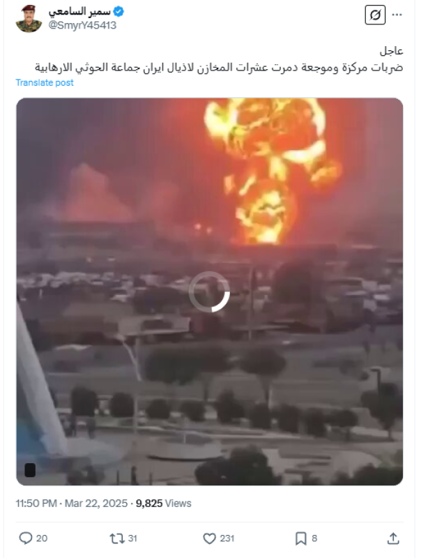 نشرت حسابات على منصة إكس مقطع فيديو لحريق، مدعية أنه ناجم عن غارات أمريكية حديثة استهدفت مخازن لجماعة الحوثيين في الحديدة ، وجاء تداول الادعاء بعد وقت قصير من نشر قناة المسيرة التابعة لجماعة الحوثيين خبرا عن غارات أمريكية استهدفت مطار الحديدة