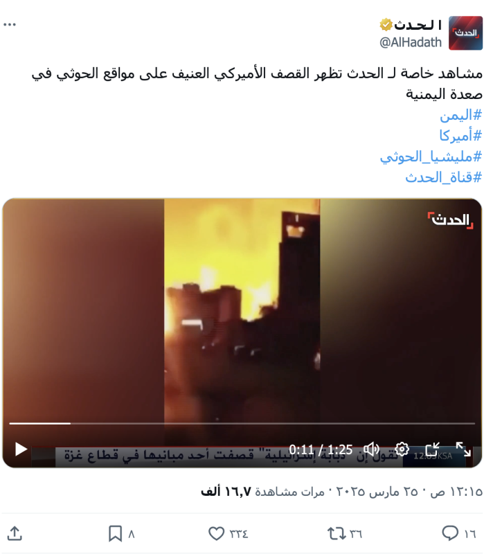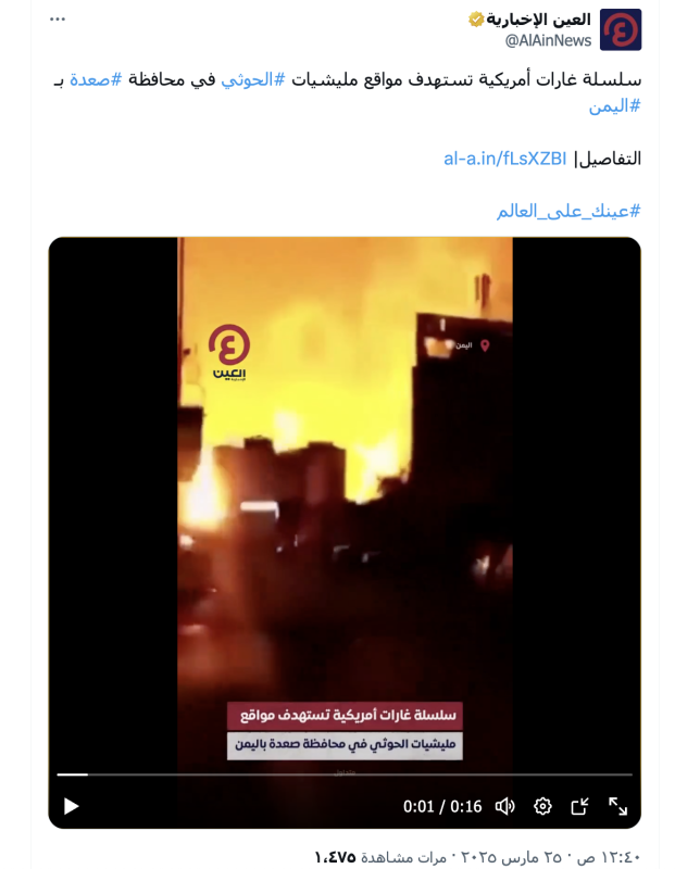 نشرت حسابات وصفحات على منصة إكس مقطع فيديو ادعت أنه يظهر غارة أمريكية على معاقل جماعة الحوثيين في محافظة صعدة شمالي اليمن مؤخرا، وجاء نشر الادعاء بعد وقت قصير من شن الطيران الأمريكي 12 غارة على مناطق في محافظة صعدة 9 منها استهدفت مدينة صعدة ومحيطها و3 غارات على مديريات ساقين وكتاف وسحار.