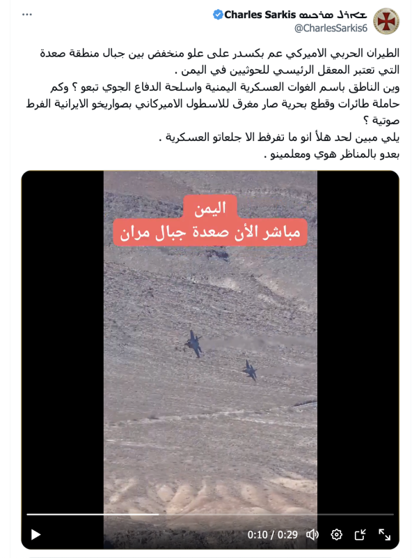 تداولت حسابات وقنوات على منصة إكس مؤخرا مقطع فيديو مدعية أنه لتحليق الطائرات الأمريكية فوق جبال صعدة؛ جاء تداول الادعاء عقب سلسلة من الغارات التي نفذها الطيران الأمريكي مواقع للحـ.ـوثيين في عدد من المحافظات مساء الثلاثاء