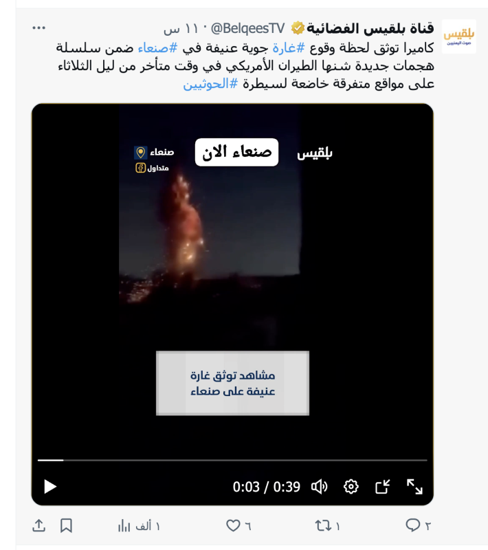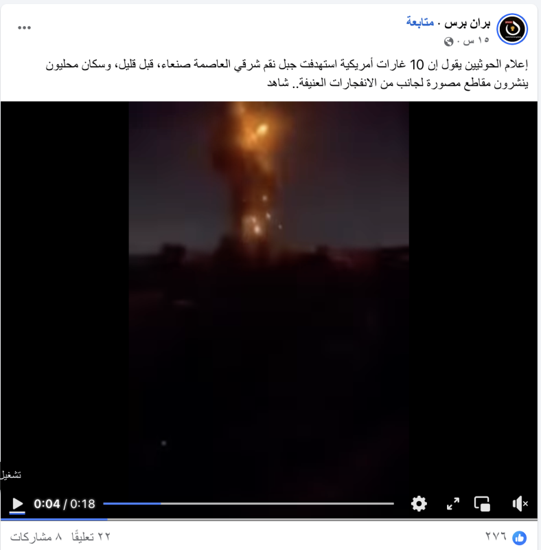 نشرت حسابات وصفحات على منصات التواصل الاجتماعي مقطع فيديو ادعت أنه يوثق غارة أمريكية عنيفة على مخازن أسلحة تابعة لجماعة الحـوثيين بالعاصمة صنعاء