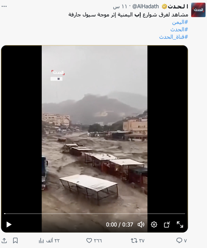 نشرت حسابات على منصات التواصل الاجتماعي يومي 13، 14 أبريل/نيسان الجاري، مقطع فيديو ادعت أنّه يوثق سيولا جارفة تجتاح مدينة إب وسط اليمن.