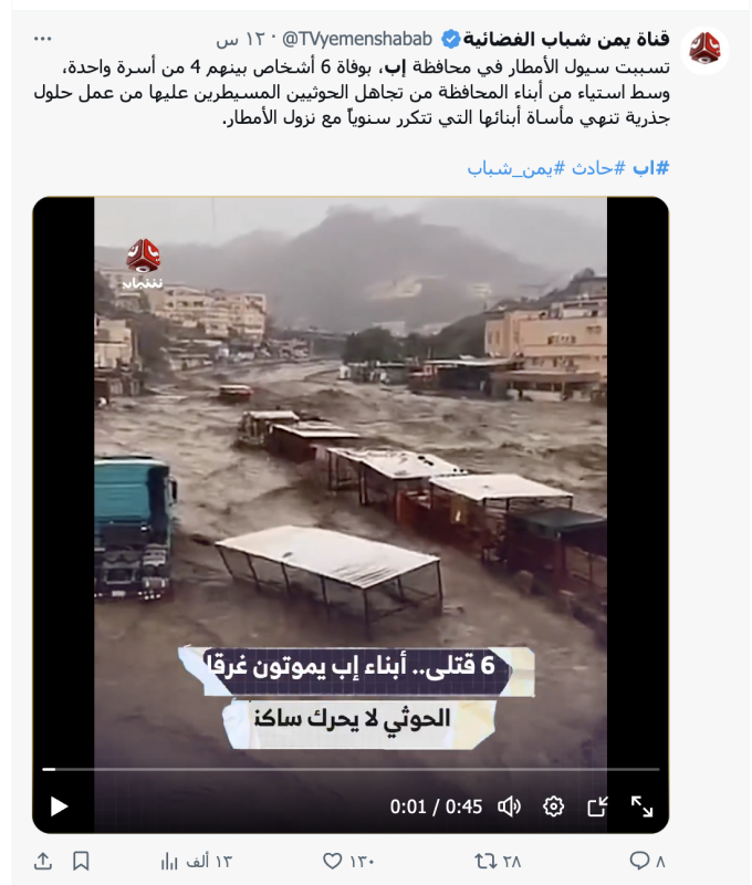 ويأتي نشر الادعاء بالتزامن مع الأمطار الغزيرة التي شهدتها عدد من المحافظات اليمنية مؤخرًا. وقد تسببت سيول الأمطار في جرف ثلاثة أشخاص في قرية الناقل بمديرية السبرة، محافظة إب بحسب بيان للدفاع المدني.