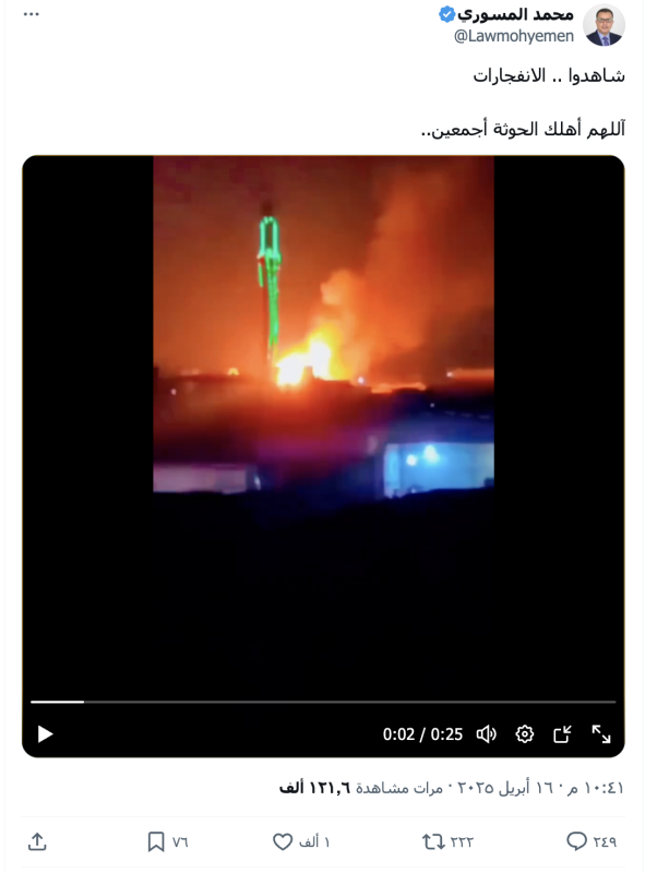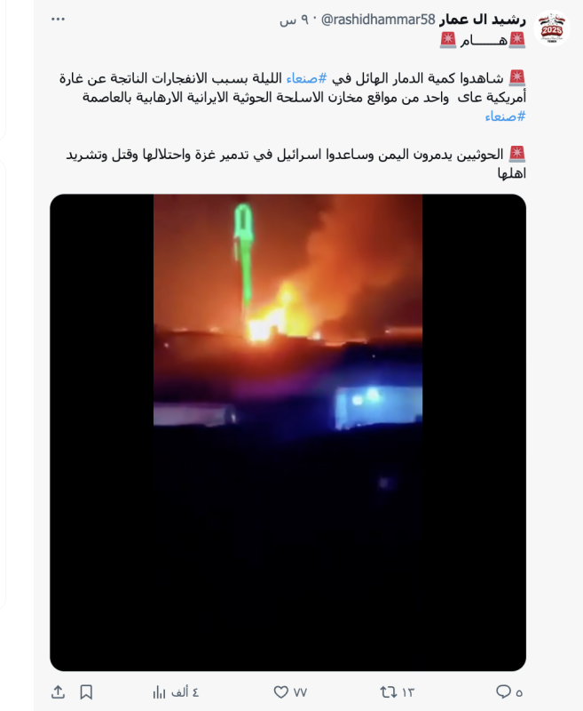 نشرت حسابات وصفحات على منصات التواصل الاجتماعي إكس وفيس بوك فيديو مدعية أنه يظهر انفجار عنيف أثر قصف الطائرات الأمريكية على صنعاء مساء الأربعاء.
