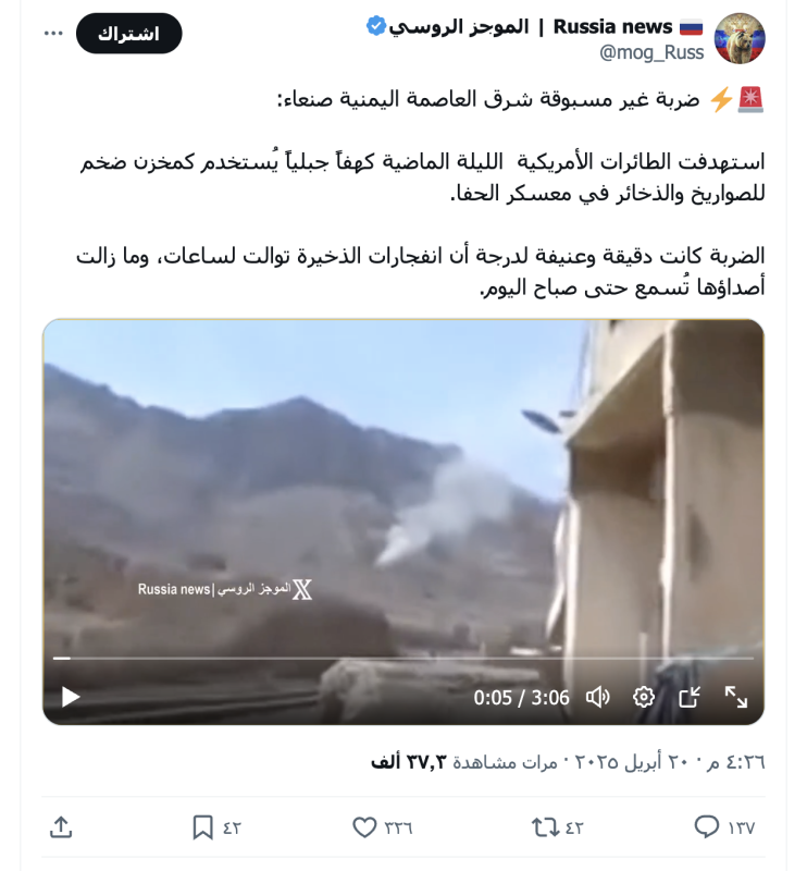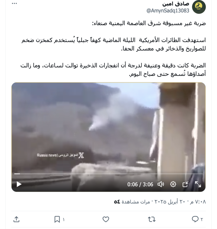 نشرت حسابات وصفحات على منصة التواصل الاجتماعي اكس مقطع فيديو مدعية أنه يظهر انفجارات حديثة لصواريخ في مخزن ضخم بمعسكر الحفا أثر قصف الطائرات الأمريكية على صنعاء مساء السبت بتاريخ 19 أبريل 2025 م.
