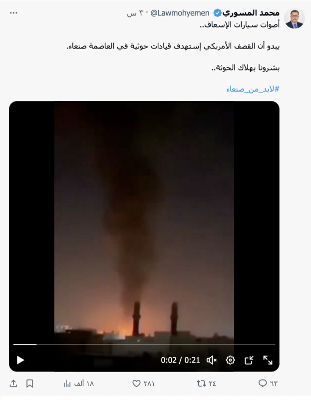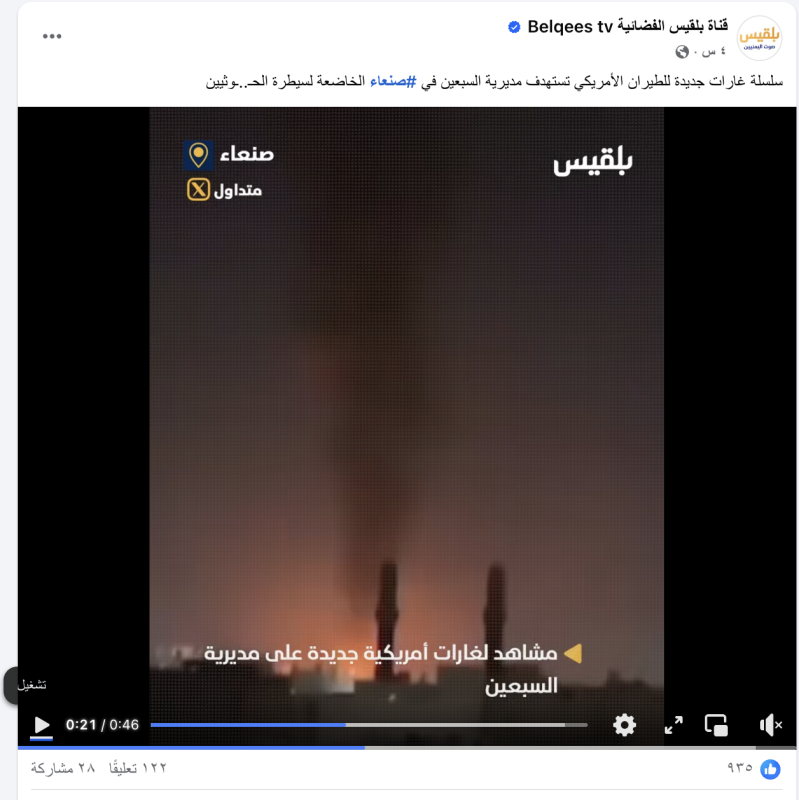 نشرت حسابات وصفحات على منصات التواصل الاجتماعي مقطع فيديو ادعت أنه يظهر القصف الأخير على مديرية السبعين بالعاصمة اليمنية صنعاء