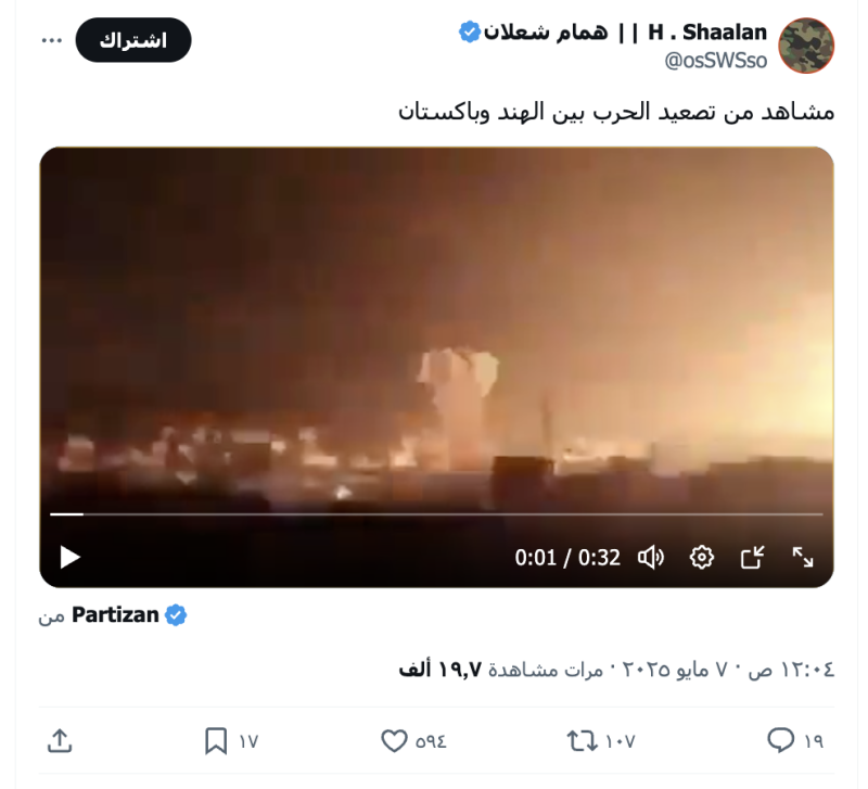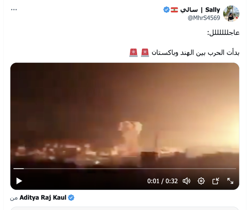 نشرت حسابات وصفحات على منصة إكس فيديو يظهر قصفا جويا مدعية أنه يوثق لحظات إشتعال الحرب بين الهند وباكستان فجر اليوم