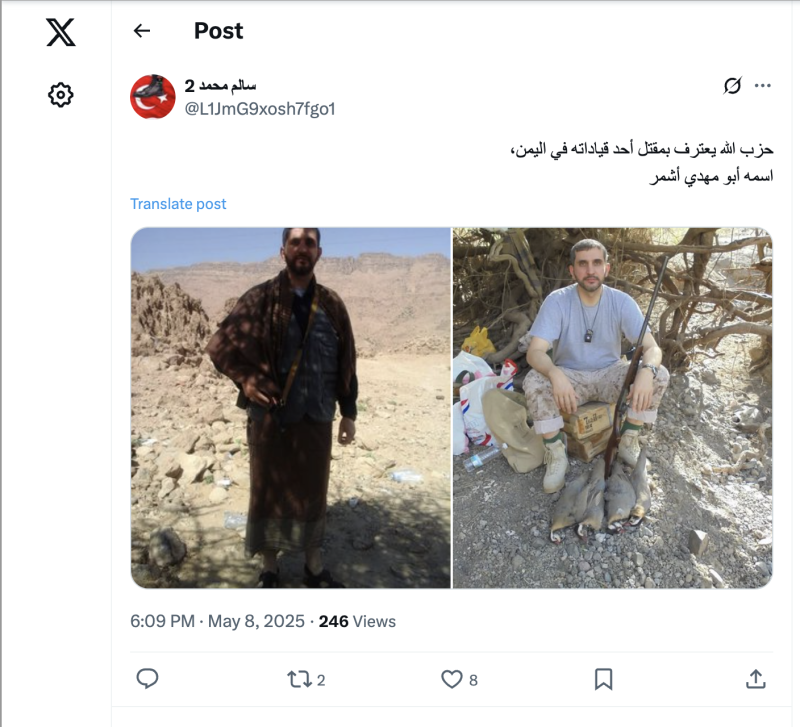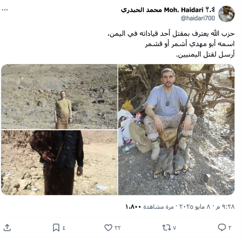 تداولت حسابات وصفحات على منصة إكس (تويتر سابقًا) صورة زُعم أنها تعود لقيادي في حزب الله قُتل مؤخرًا في الغارات الأمريكية على اليمن. هذا الادعاء انتشر بشكل واسع بعد أن نشرت حسابات لبنانية الصورة ذاتها، مشيرة إلى أن الشخص الظاهر فيها لعب دورًا كبيرًا في التعاون مع جماعة الحوثيين منذ عام 2015.