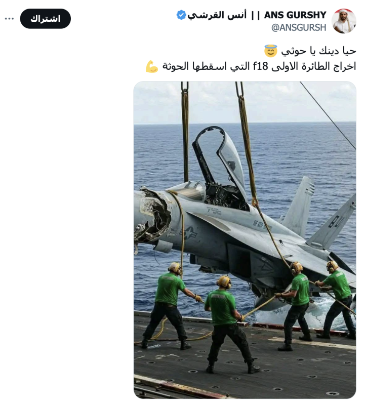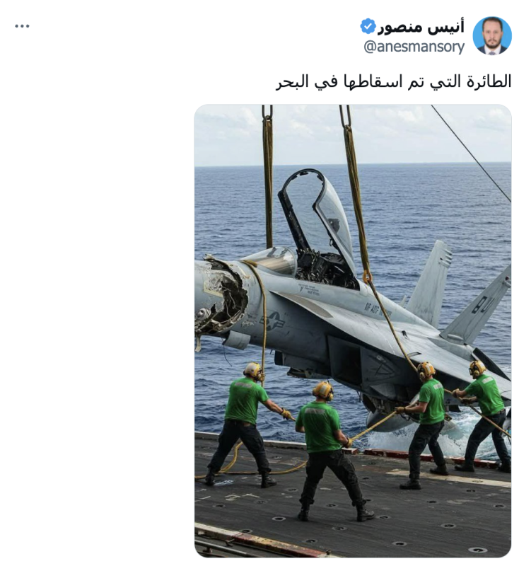 نشرت حسابات وصفحات على منصة إكس صورة ادعت أنها لطائرة امريكية يتم إخراجها من البحر بعد قصف من قبل جماعة الحوثي على حاملة الطائرات هاري ترومان .