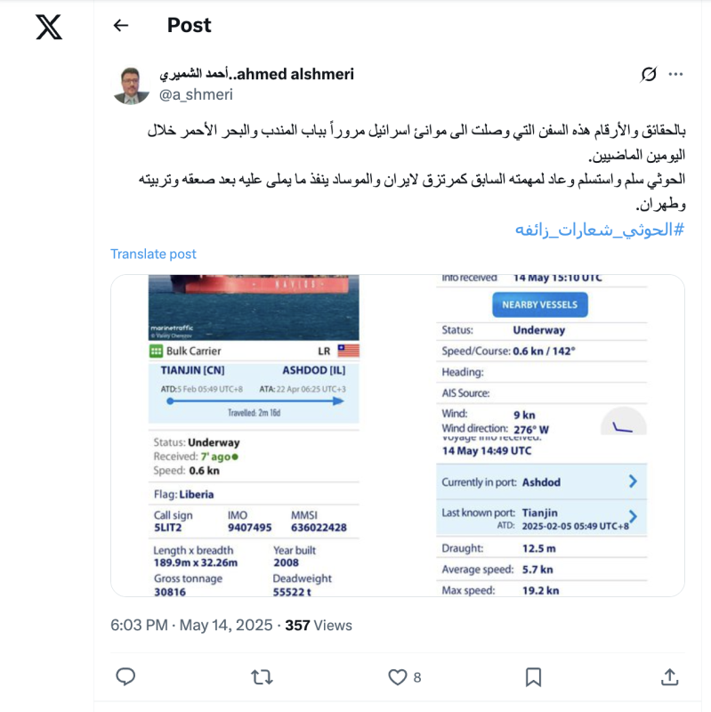 تداولت حسابات وصفحات على منصات التواصل الاجتماعي والمواقع الإلكترونية خبرًا يزعم أن مراصد ملاحية سجلت دخول سفن تجارية إلى موانئ الاحتلال الإسرائيلي بعد عبورها مضيق باب المندب والبحر الأحمر.