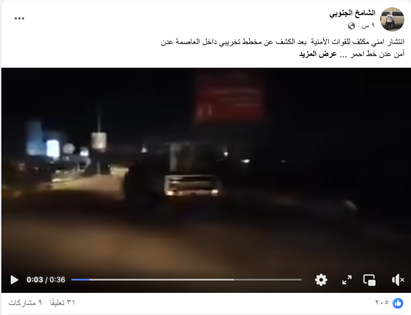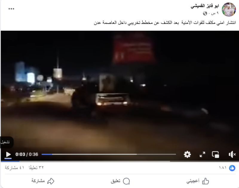 انتشر مؤخرًا على منصة فيسبوك مقطع فيديو يُزعم أنه يُظهر انتشارًا مكثفًا للقوات الأمنية في العاصمة اليمنية المؤقتة عدن، بزعم أنه جاء بعد الكشف عن "مخطط تخريبي" في المدينة.
