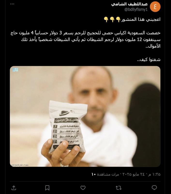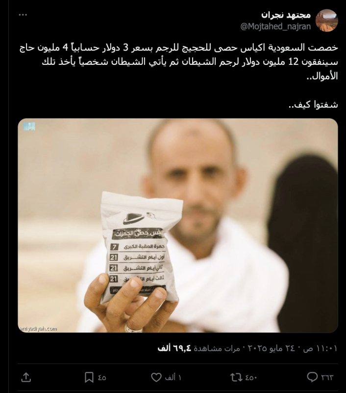 تداولت حسابات وصفحات على منصة "إكس" (تويتر سابقاً) صورة تُظهر أكياس حصى رمي الجمرات، وزعمت أن السلطات السعودية تقوم ببيعها للحجاج مقابل 3 دولارات لكل حاج.