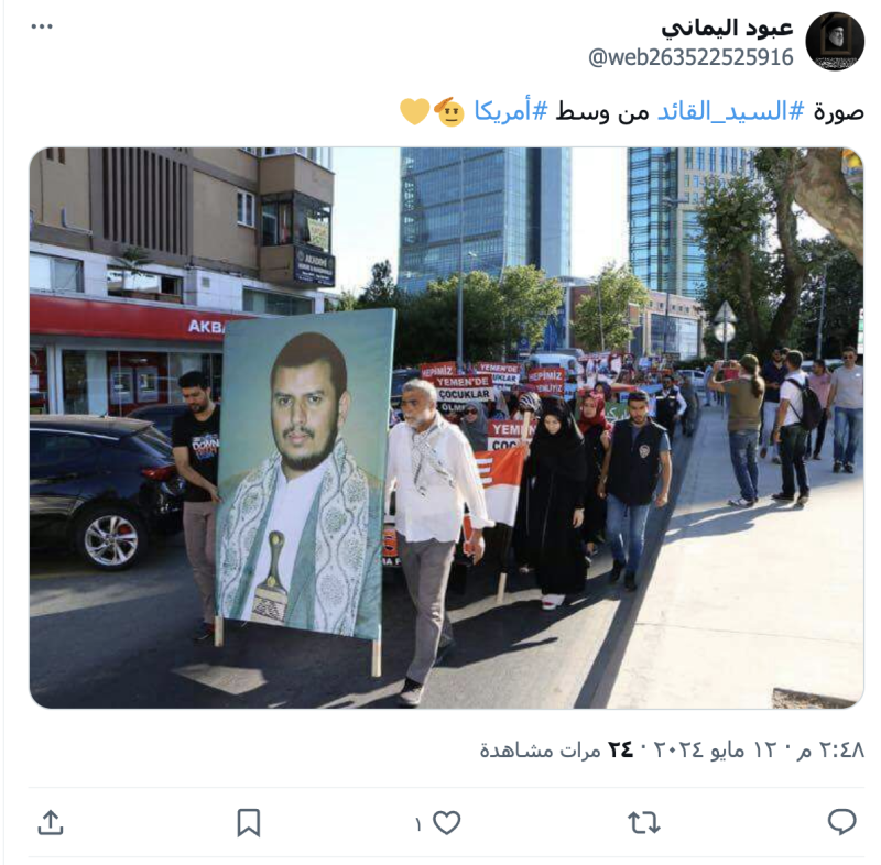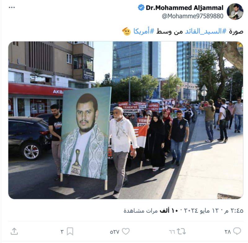 نشرت حسابات على منصة إكس صورة لمسيرة قديمة ترفع صورة زعيم جماعة الحوثيين في اليمن عبد الملك الحوثي مدعية أن المسيرة لمتظاهرين في أمريكا يرفعون صورة الحوثي.