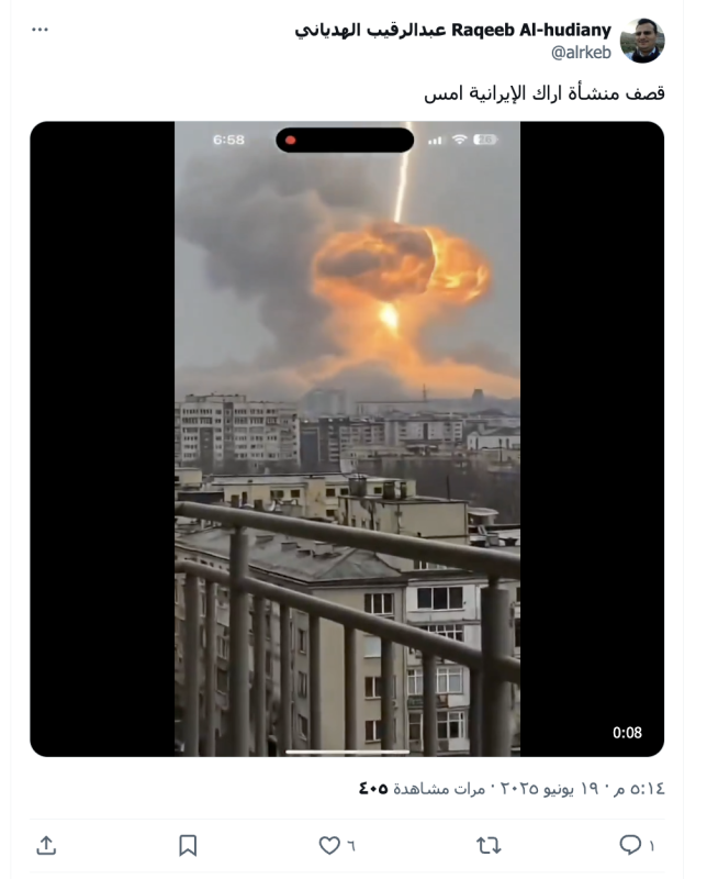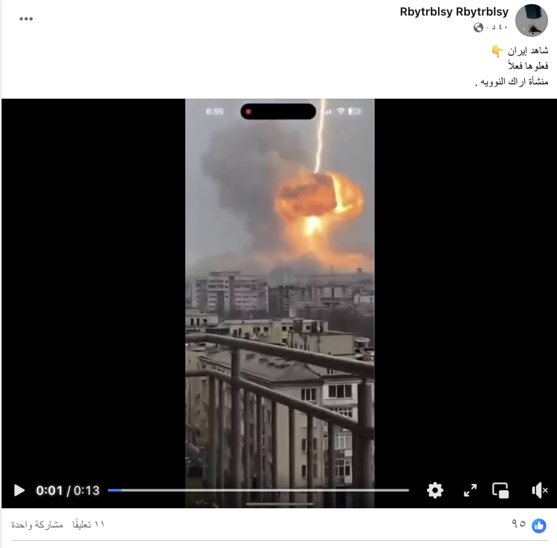 تداولت حسابات وصفحات على منصتي التواصل الاجتماعي فيسبوك وإكس (تويتر سابقًا) مقطع فيديو مدعيةً أنه يظهر هجومًا إسرائيليًا على منشأة أراك النووية في إيران.