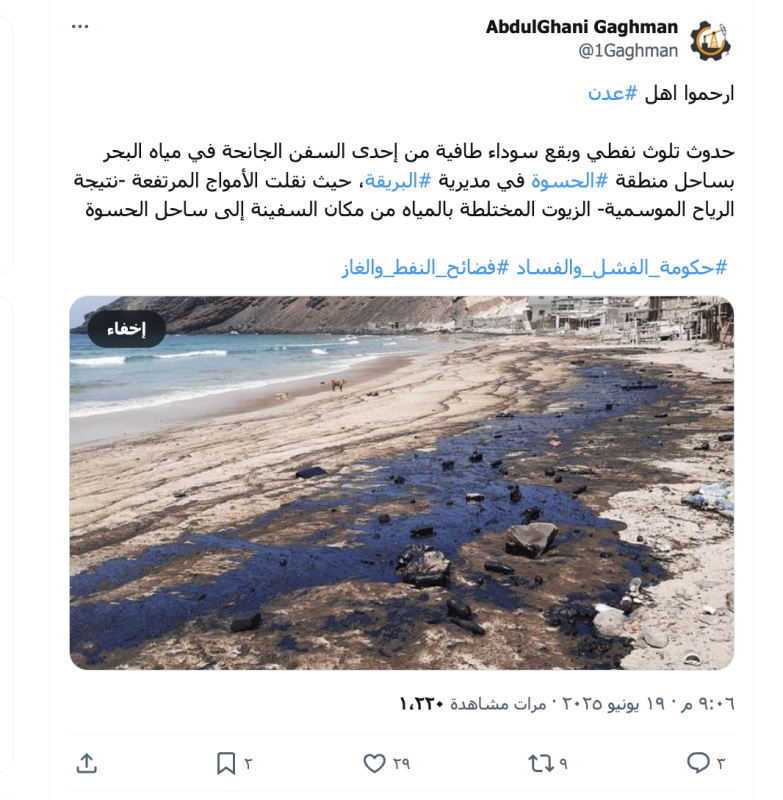 جاء تداول الادعاء بعد تداول خبر وشكاوي من الصيادين أن هناك تلوث نفطي بمادة المازوت في شاطئ منطقة الشعب وساحل المهرام -عدن.