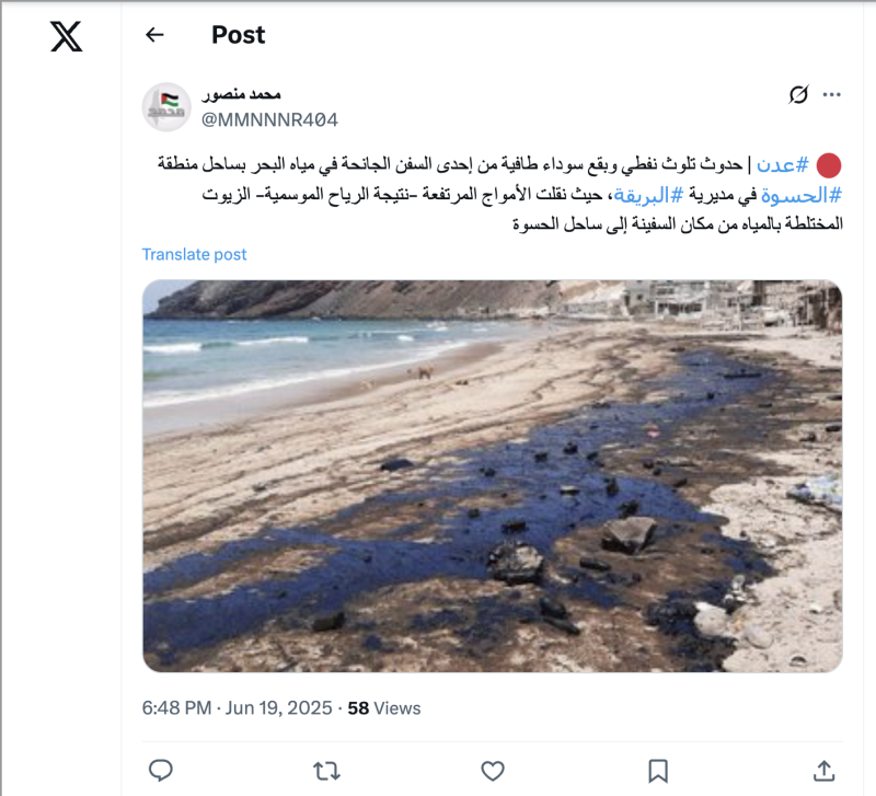 نشرت حسابات وصفحات على منصتي إكس وفيسبوك صورة ادعت أنها لتلوث نفطي حديث على سواحل منطقة الحسوة مديرية البريقة محافظة عدن.