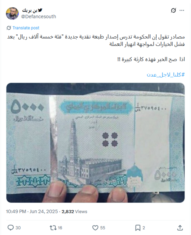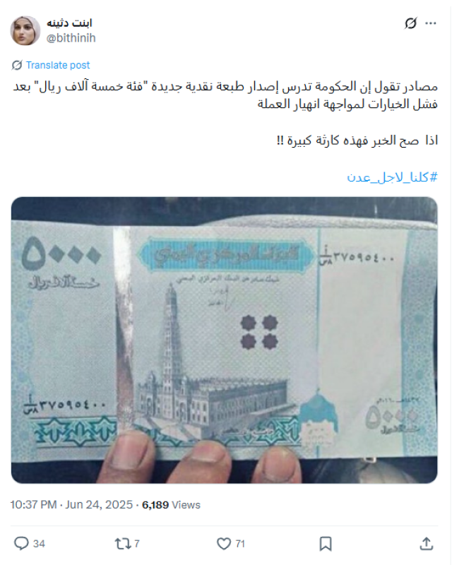 تداولت حسابات على منصة "إكس" يوم الأربعاء، 26 يونيو 2025، صورة لما يبدو أنها ورقة نقدية من فئة خمسة آلاف ريال، منسوبة إلى البنك المركزي اليمني، مع ادعاء بأن "الحكومة تدرس إصدار طبعة نقدية جديدة من هذه الفئة بعد فشل الخيارات لمواجهة انهيار العملة".