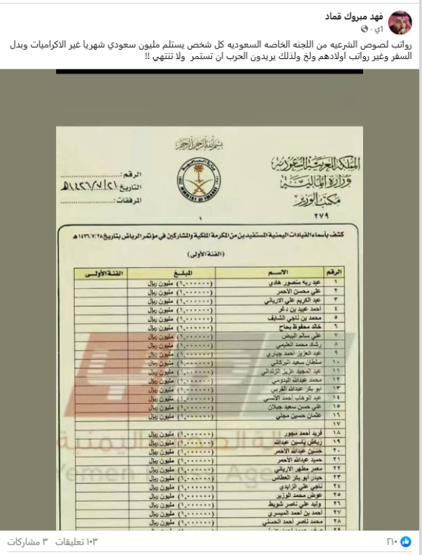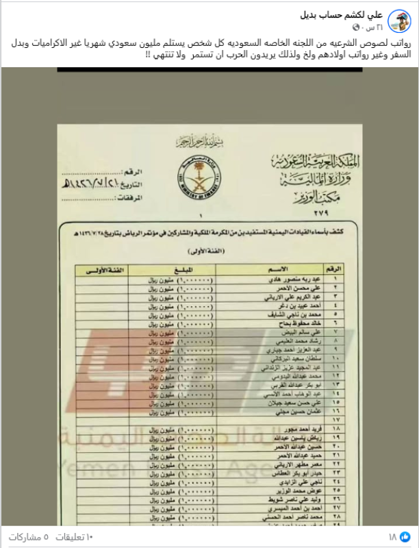 تداولت صفحات على فيسبوك، 27 يونيو/حزيران الجاري، صورة يُزعم أنها لكشف رواتب مسؤولين في الحكومة الشرعية، يتقاضونها من "اللجنة الخاصة" السعودية.