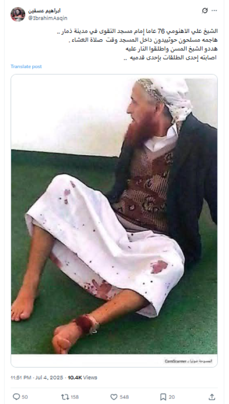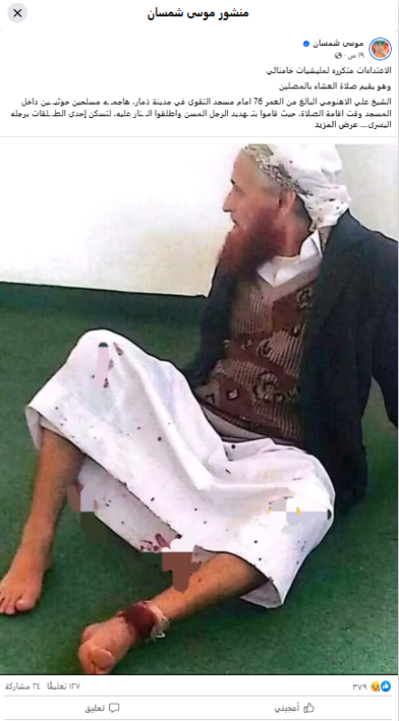 تداولت حسابات وصفحات على منصتي فيسبوك وإكس، مؤخرا، صورة تدعي أنها توثّق حادثة اعتداء حديث على الشيخ علي الأهنومي إمام مسجد التقوى في مدينة ذمار، من قِبل مسلحين حوثيين داخل المسجد أثناء إقامة الصلاة، ما أسفر عن إصابته برصاصة في ساقه.