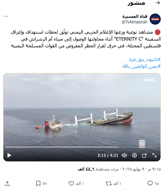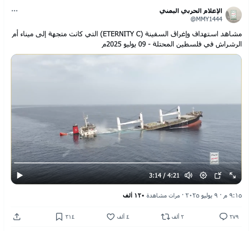 نشرت حسابات وصفحات على منصات التواصل الاجتماعي مقطع فيديو بثته جماعة الحوثيين في اليمن لإغراق سفينة إيترنيتي سي في البحر الأحمر مدعية أن السفينة كانت متجهة إلى ميناء أم الرشراش (إيلات) في فلسطين