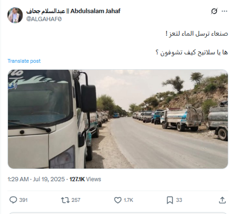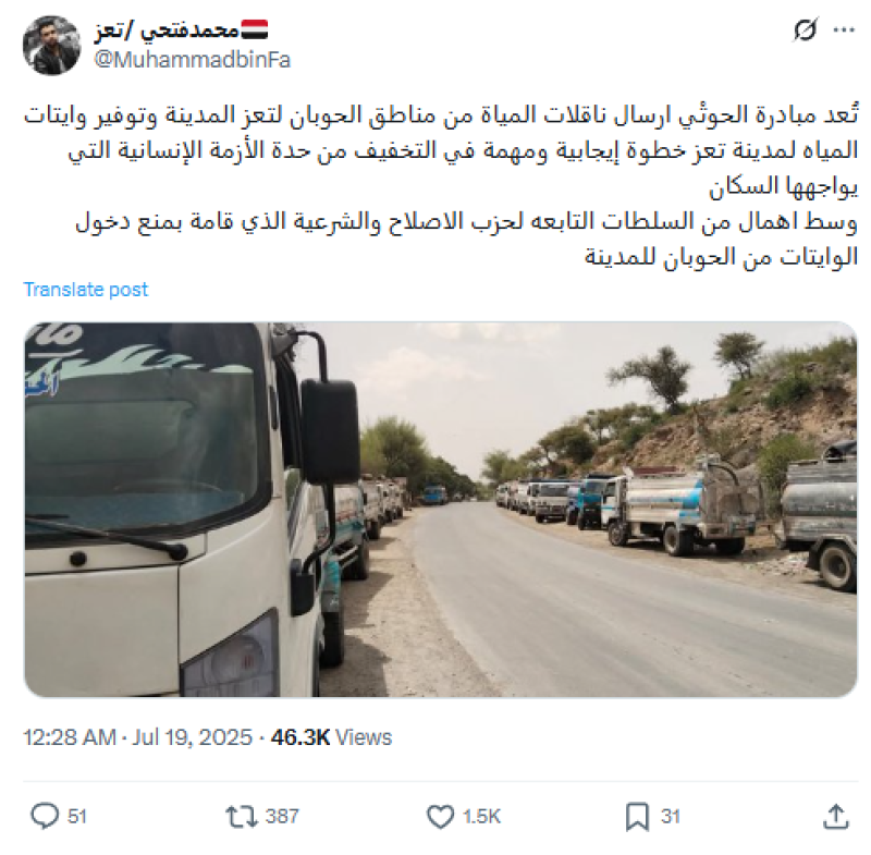 كما لم يصدر عن جماعة الحوثيين – حتى لحظة نشر التقرير – أي إعلان رسمي عبر قنواتها الرسمية عن "مبادرة إسعافية" تتعلق بإرسال ناقلات ماء إلى مدينة تعز.