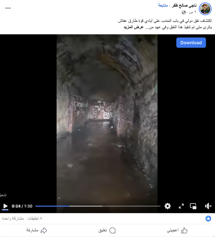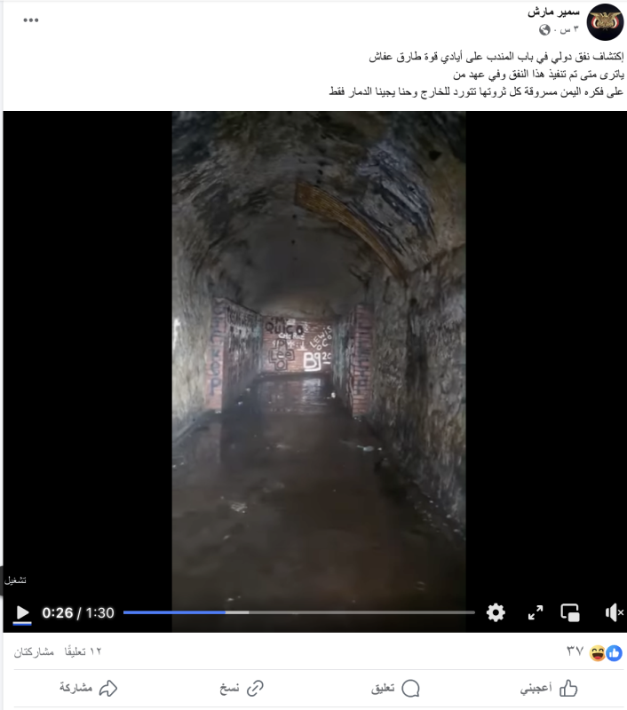 نشرت حسابات وصفحات على منصات التواصل الاجتماعي فيس بوك وإكس مقطع فيديو مدعية أنه يظهر نفق دولي تم اكتشافه في باب المندب.