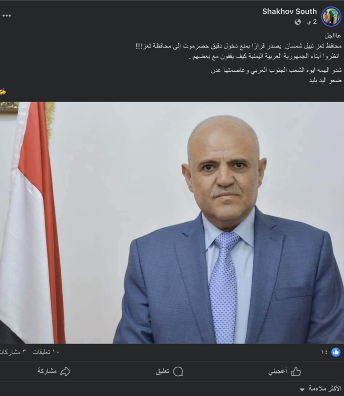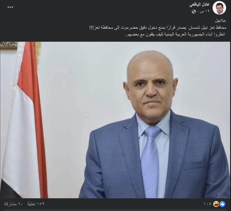 نشرت حسابات على منصة فيسبوك خبرا أدعت فيه أن محافظ محافظة تعز نبيل شمسان يصدر قرار بمنع دخول دقيق حضرموت إلى المحافظة.