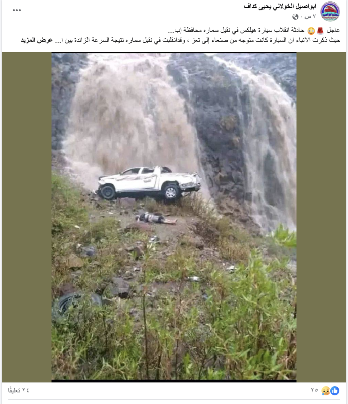 تحقق يوم يوب من الادعاء وتبين أنه مضلل إذ إن الصورة الحادثة تعود إلى مارس 2023 حيث انزلقت سيارة تقل أسرة عبده الشجني من أبناء محافظة ذمار في نقيل سمارة بسبب الأمطار والسرعة، ما أسفر عن وفاة أربعة أشخاص بينهم امرأتان" كانوا في طريقهم إلى تعز