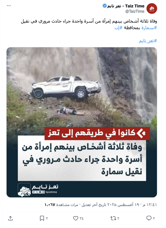 نشرت حسابات وصفحات على منصات التواصل الاجتماعي خبرا وصورة زعمت أنها لحادث مروري في نقيل سمارة نجم عنه وفاة ثلاثة أشخاص بينهم امرأة من أسرة عبده الشجني كانوا في طريقهم إلى تعز