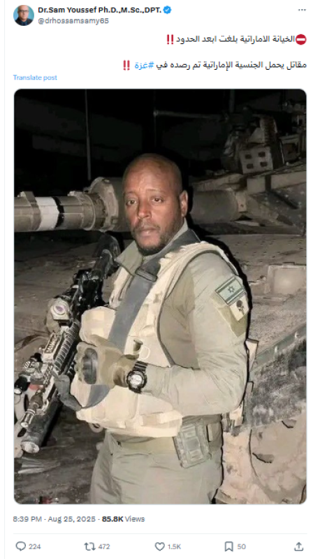 نشرت حسابات على منصتي فيسبوك وإكس صورة زُعم أنها لمقاتل يحمل الجنسية الإماراتية تم رصده في غزة، فيما ادعى آخرون أن الجندي المذكور قُتل في غزة.
