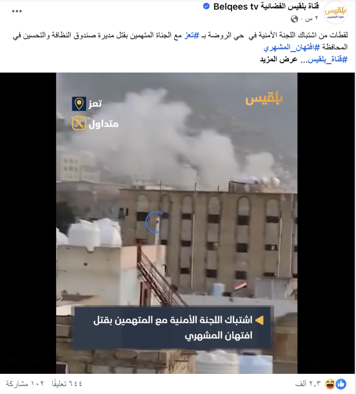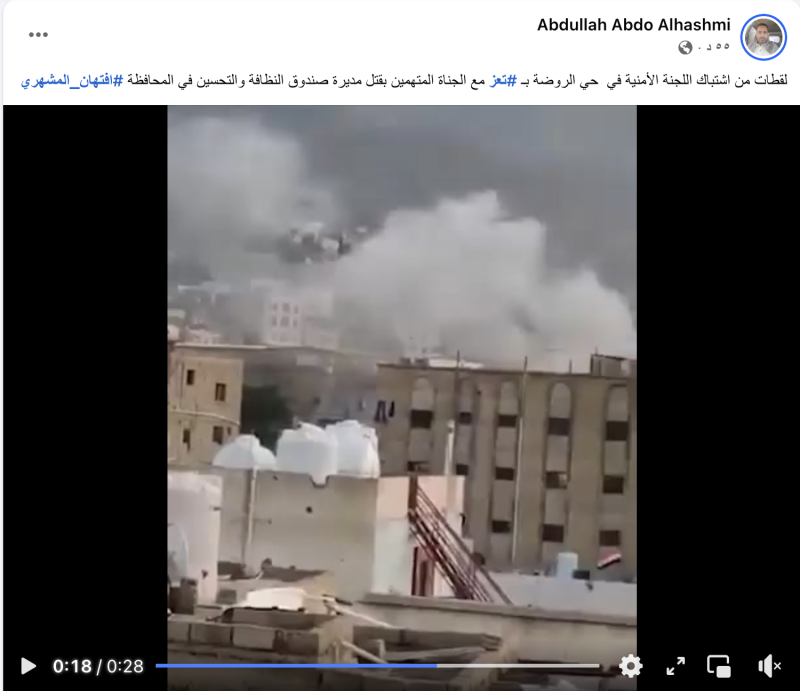 تداولت حسابات وصفحات على منصات التواصل الاجتماعي مقطع فيديو مدعية أنه يوثّق اشتباك اللجنة الأمنية في تعز مع المتهمين بقتل مديرة صندوق النظافة والتحسين في المحافظة، افتهان المشهري، في حي الروضة .