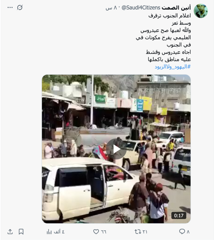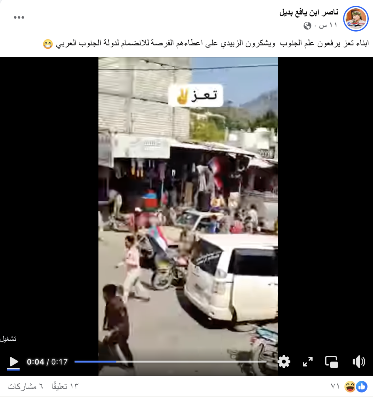 نشرت حسابات على مواقع التواصل الاجتماعي فيسبوك واكس وانستجرام الثلاثاء (7 أكتوبر) مقطع فيديو ادعت انه لمواطنين يجوبون شوارع مدينة تعز رافعين علم جنوب اليمن.