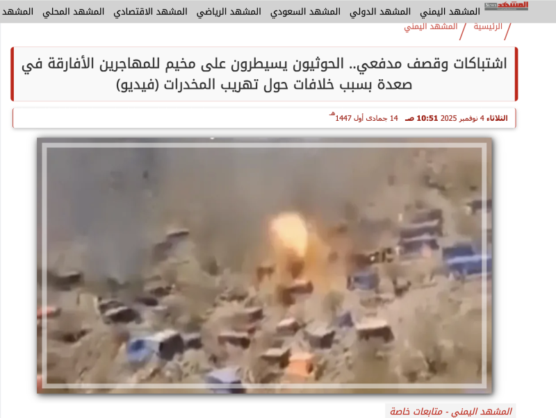 ولم نعثر على اية أخبار عن هجوم حوثي على مخيمات المهاجرين الأفارقة في صعدة عدا ما نقلته تلك الوسائل عن أحد الناشطين