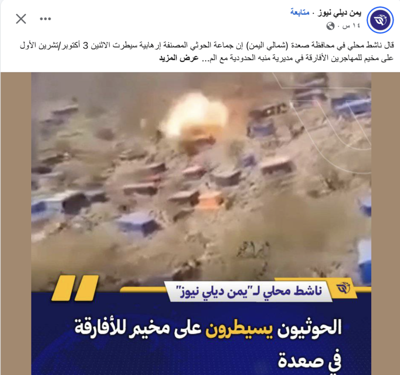 نشرت مواقع الكترونية وحسابات على منصات التواصل الاجتماعي فيديو ادعت أنه يظهر قصفا حوثيا على مخيم للمهاجرين الافارقة في صعدة على الحدود اليمنية السعودية.