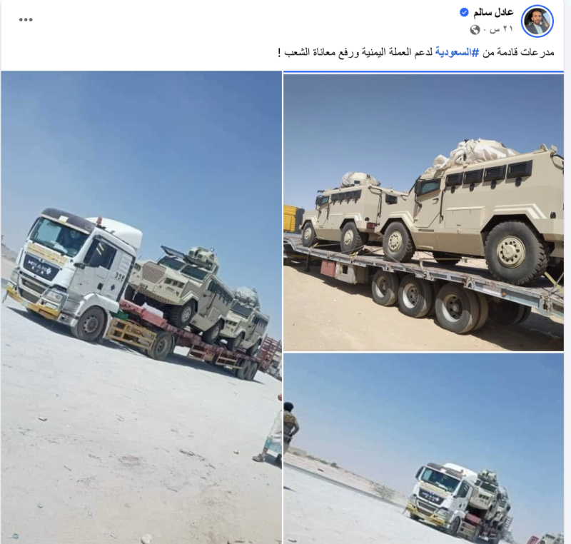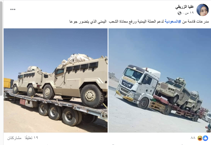 نشرت حسابات على منصة فيسبوك صور لمدرعات محملة على قاطرات مدعية أنها قادمة من السعودية إلى اليمن مؤخرا