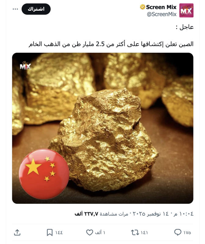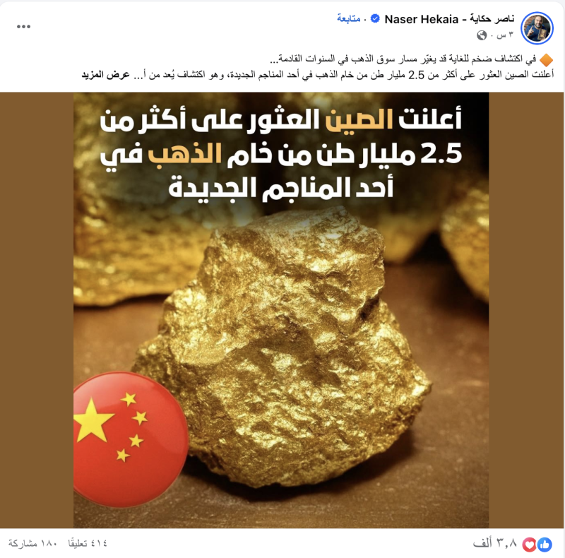 نشرت حسابات وصفحات على منصات التواصل الاجتماعي خبرا ادعت فيها أن الصين أعلنت إكتشاف نحو 2 ونصف من الذهب الخام.
