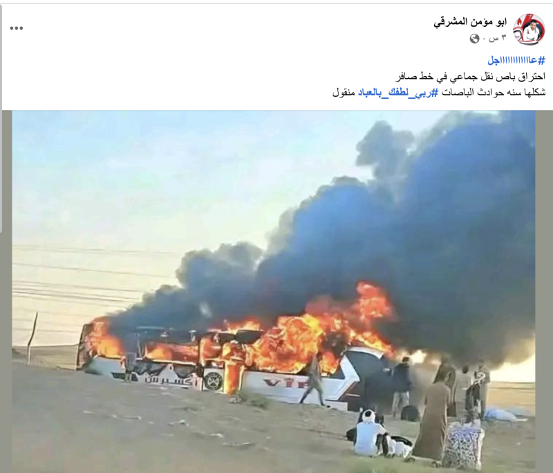 نشرت حسابات على منصة التواصل الاجتماعي فيس بوك صورة مدعين أنها لاحتراق حافلة نقل جماعي في طريق صافر محافظة مأرب حديثا.
