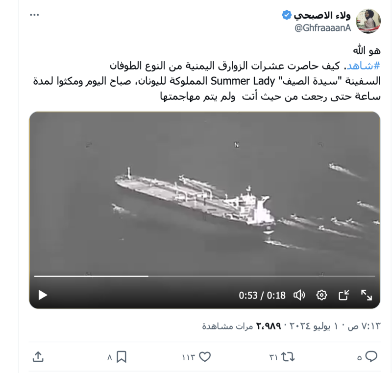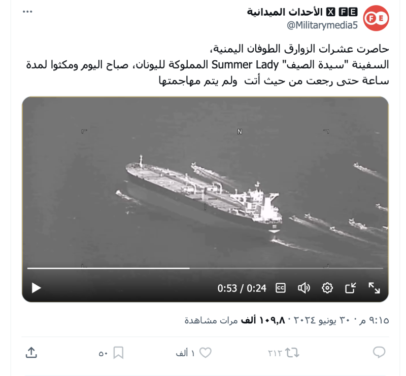 نشرت حسابات على منصة إكس مقطع فيديو ادعت أنه يظهر حصار زوارق طوفان اليمنية لسفينة " Summer Lady المملوكة لليونان في البحر الأحمر وإجبارها على التراجع من حيث أتت دون مهاجمتها.